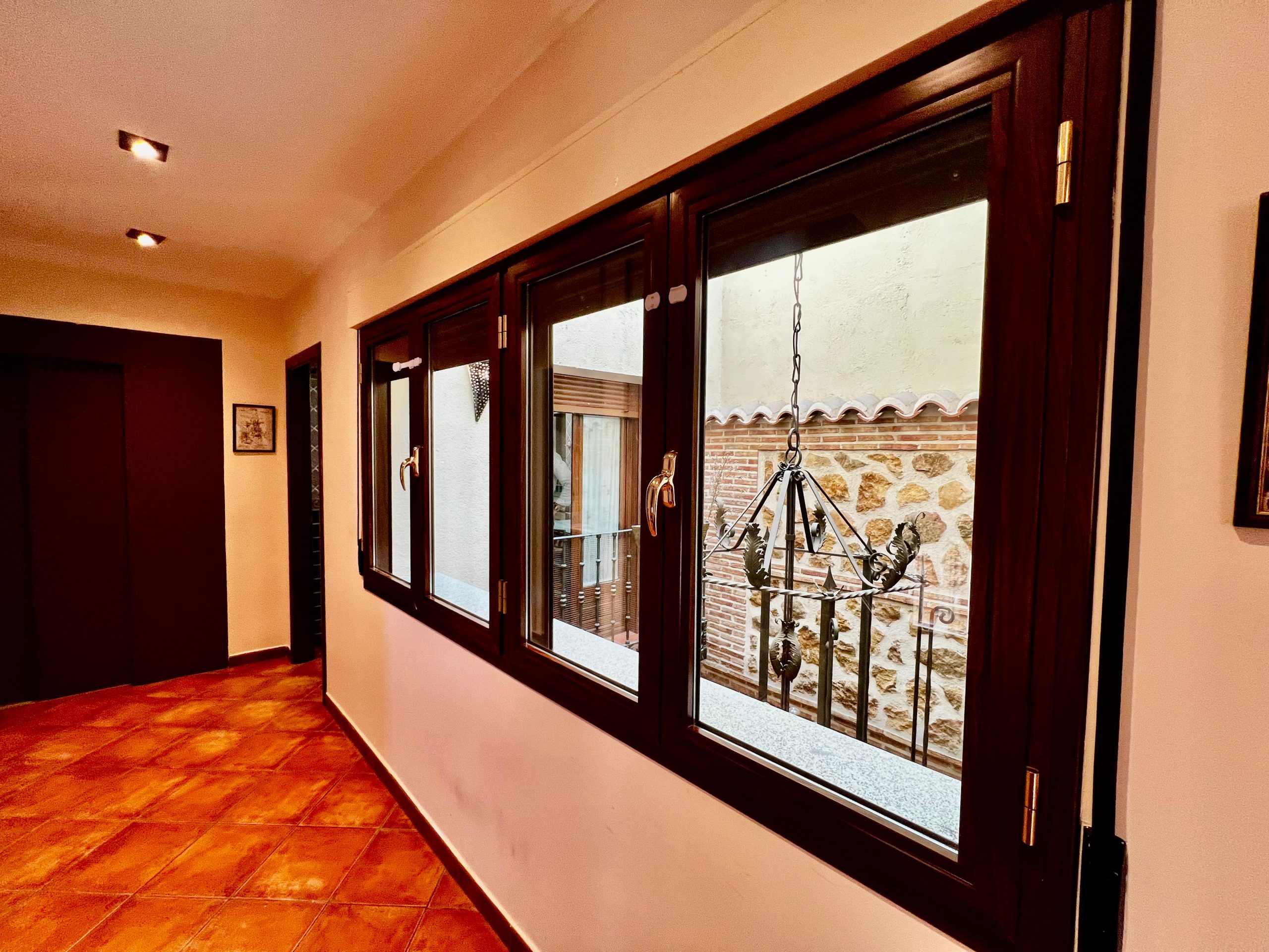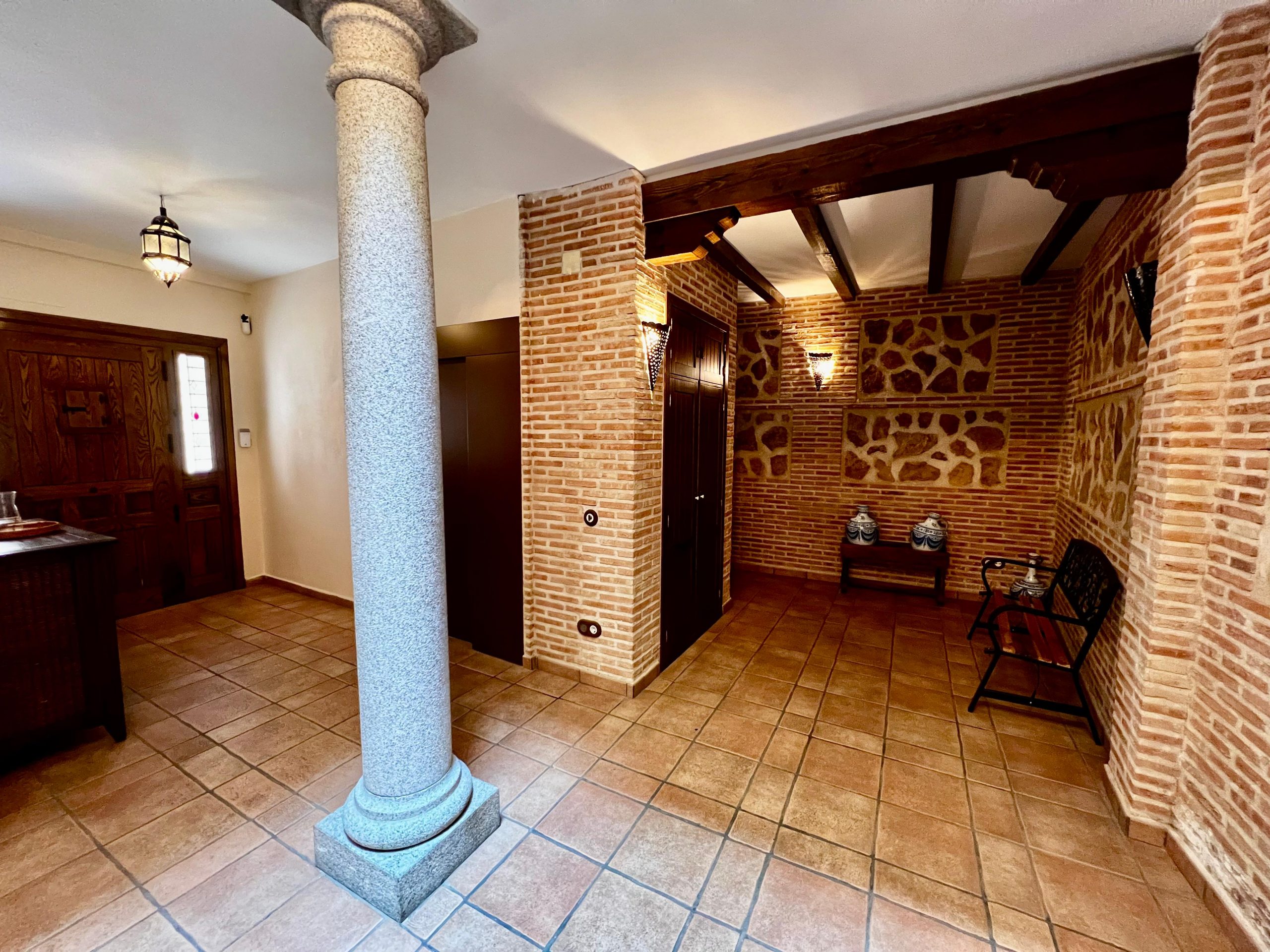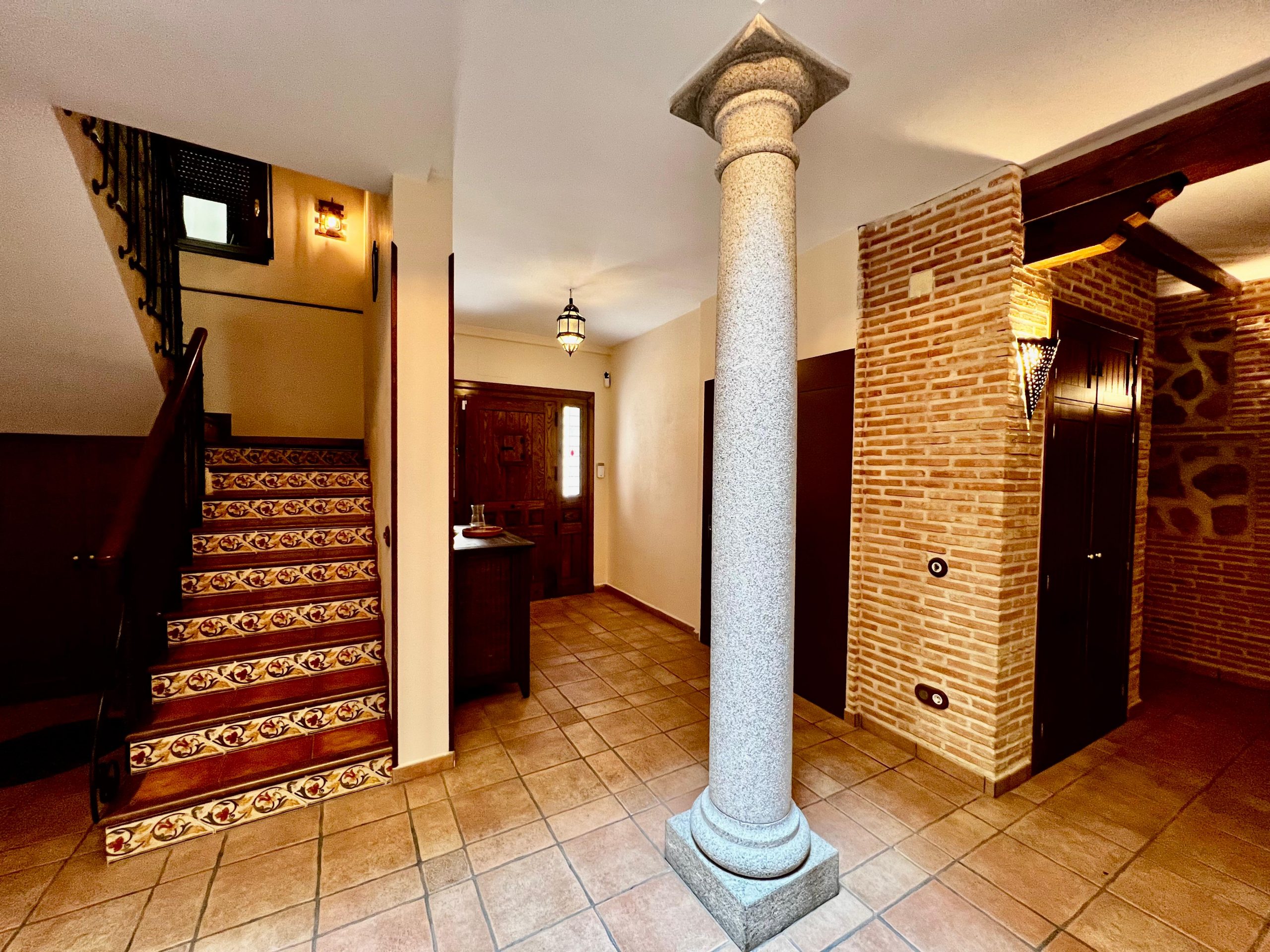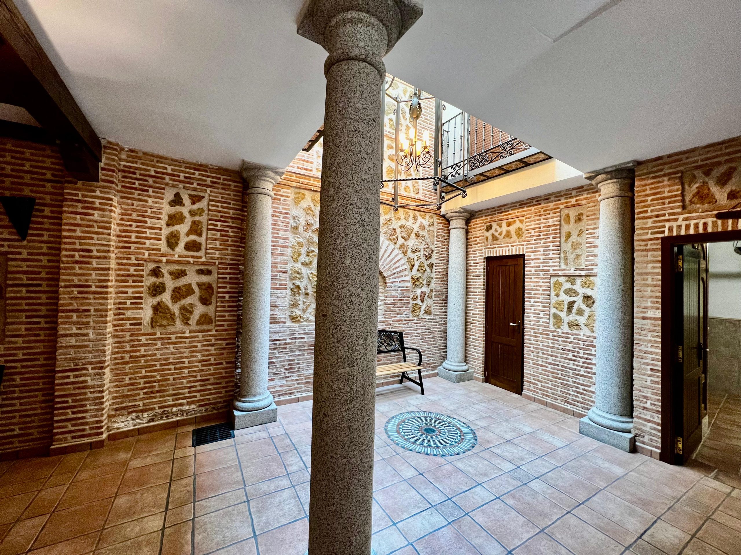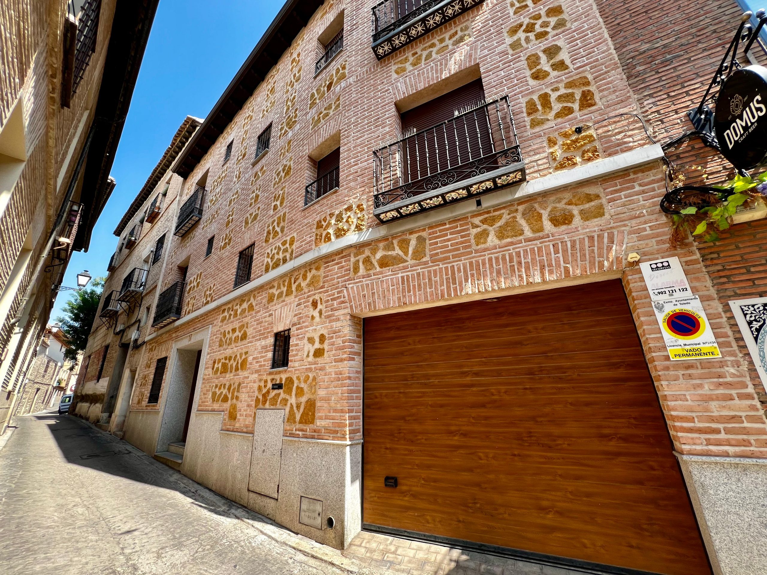 La vivienda, construida en estilo tradicional toledano, cuenta con tres plantas de altura, además de un sótano acondicionado tipo cueva, una azotea privada con vistas y un amplio garaje. Está distribuida en torno a un patio central cerrado y techado, que actúa como distribuidor de la planta baja. En él destacan sus columnas de granito y muros de ladrillo típico toledano, elementos que aportan carácter y autenticidad al conjunto.