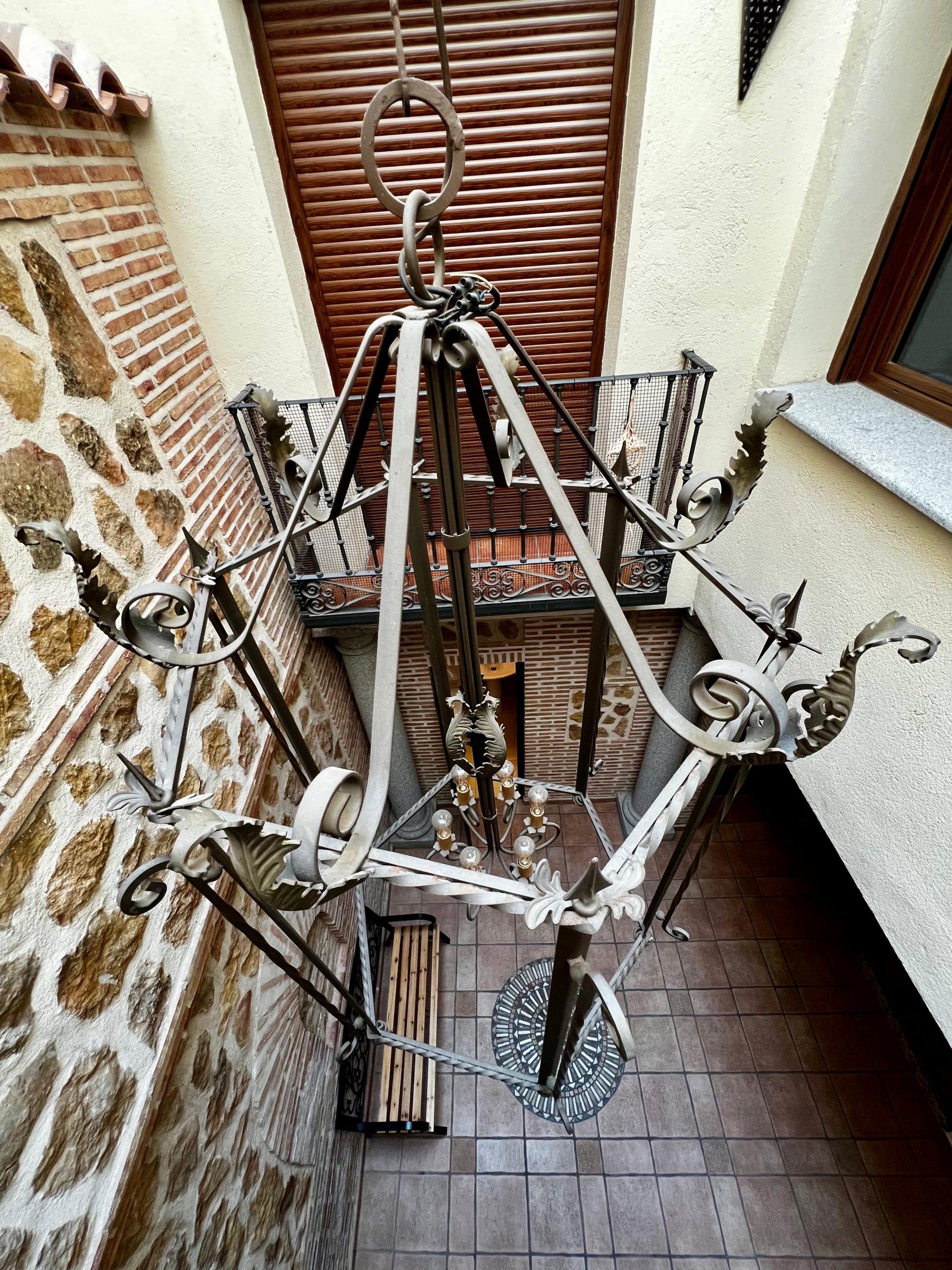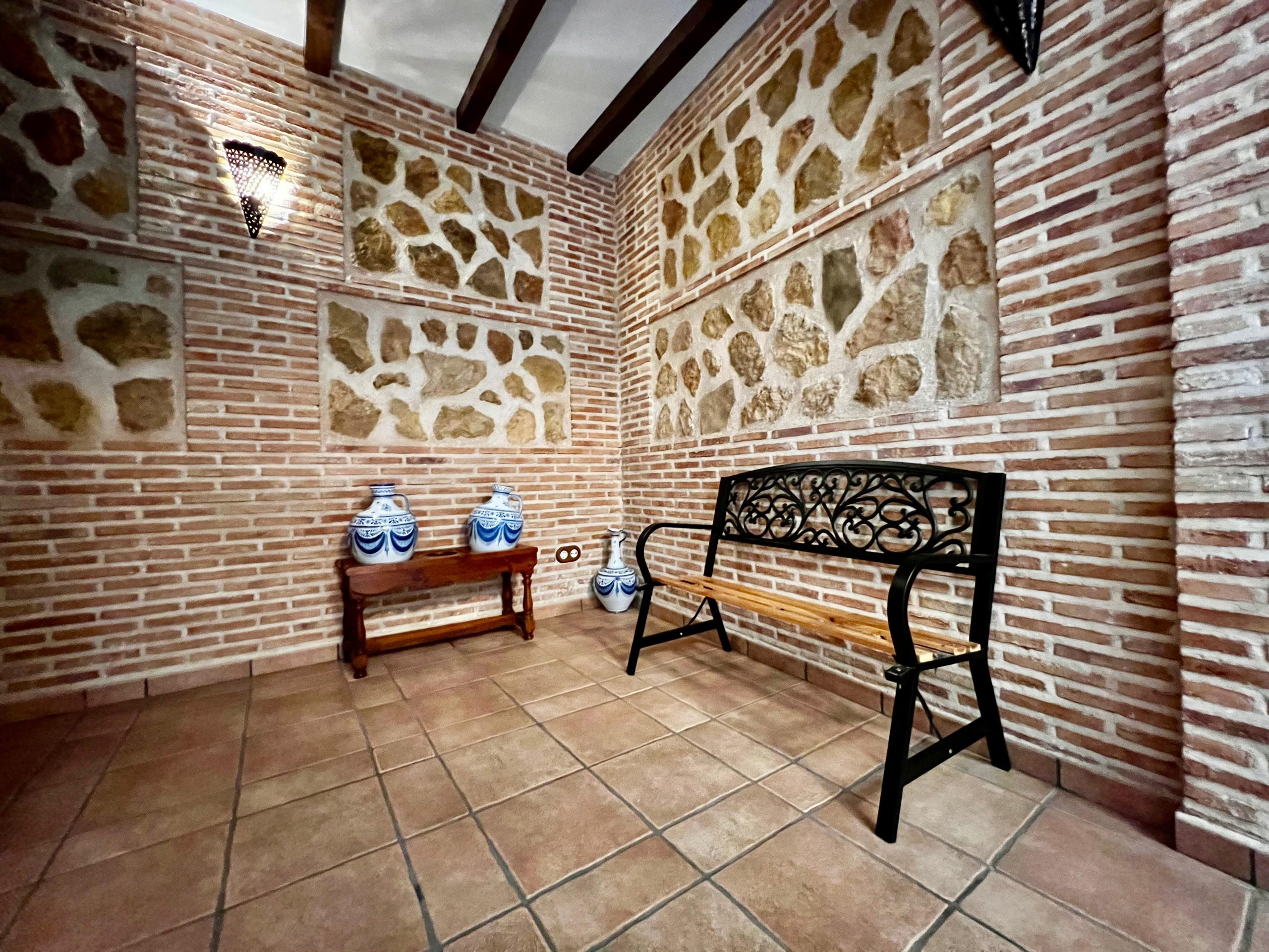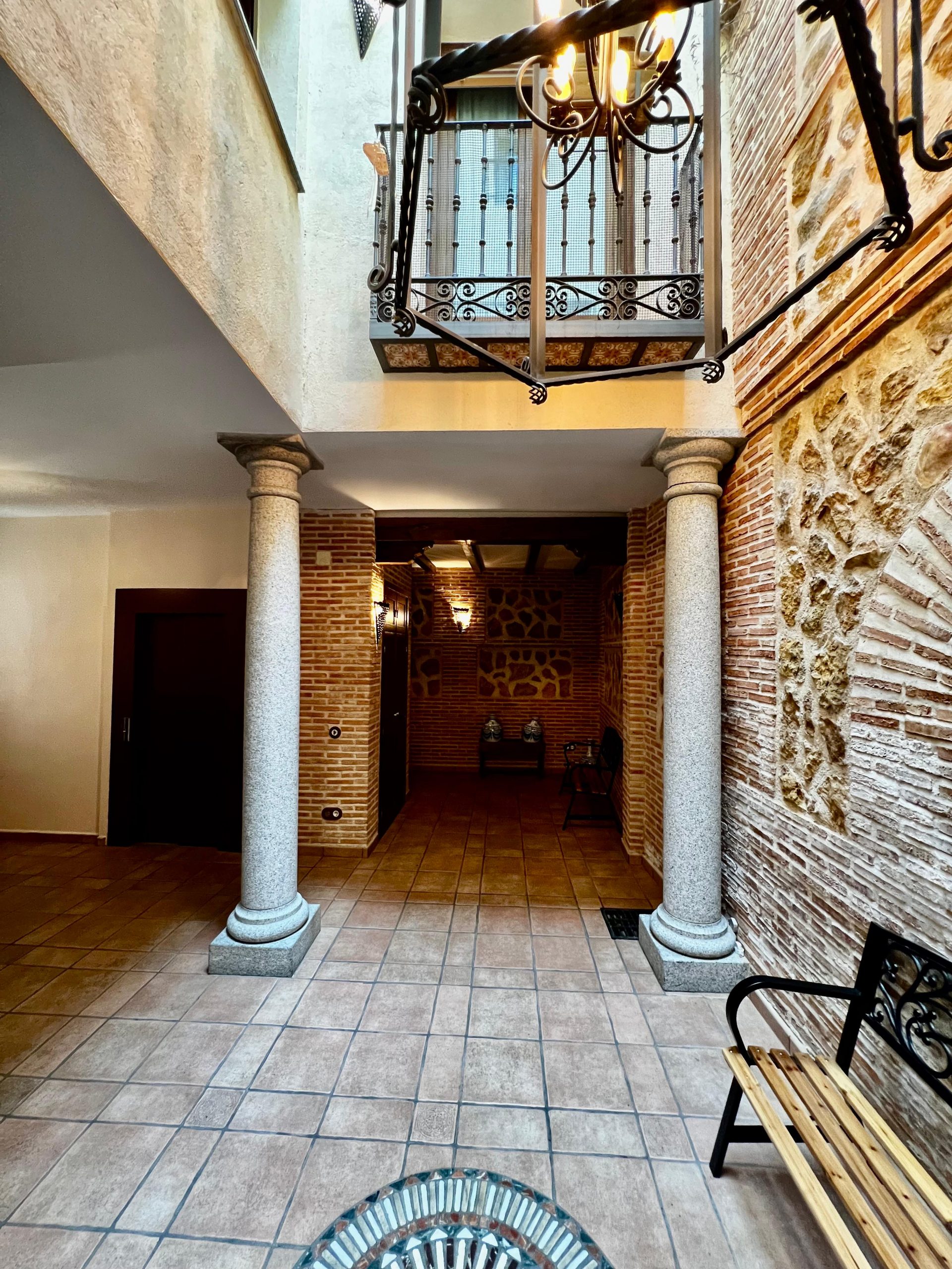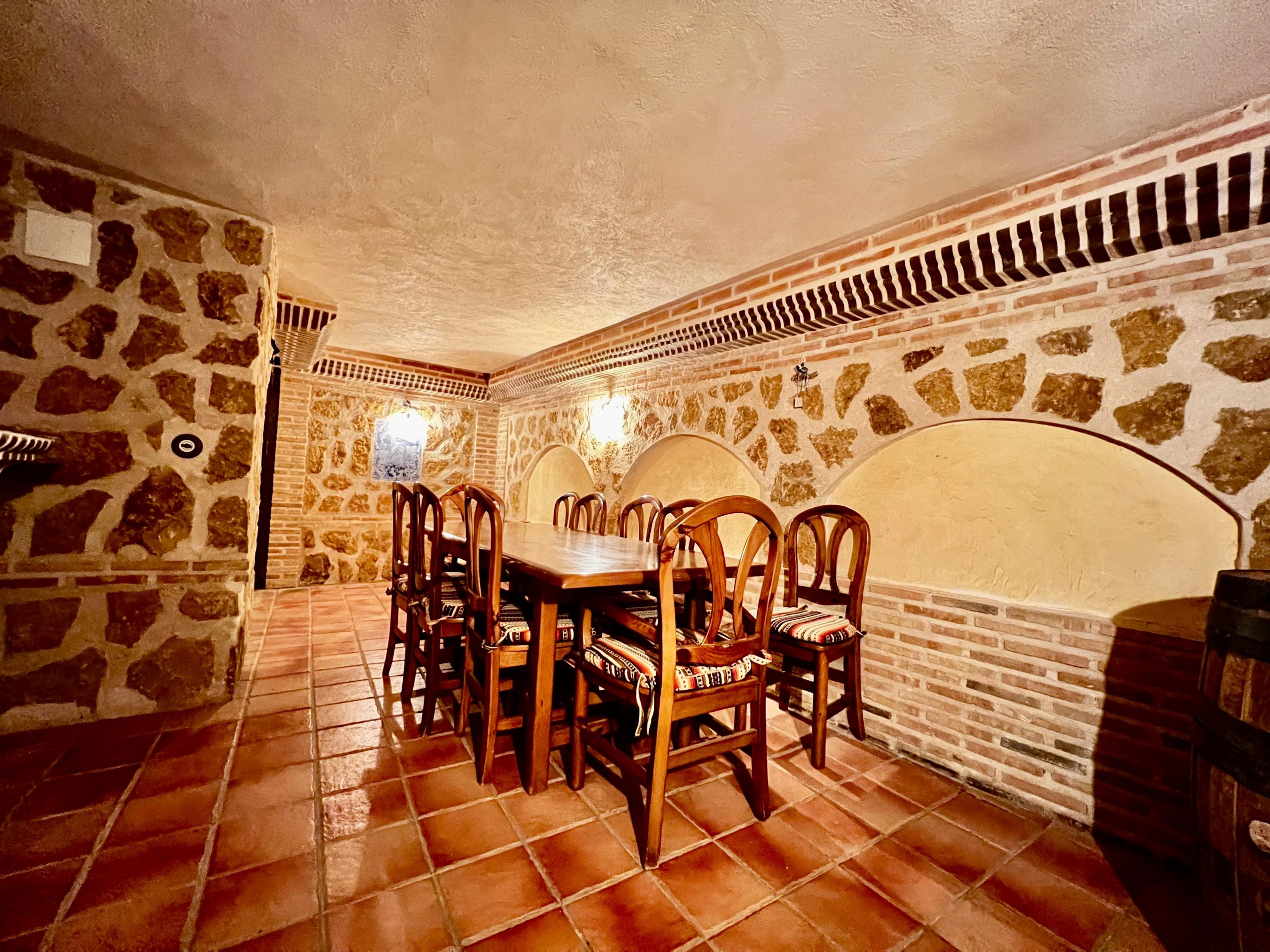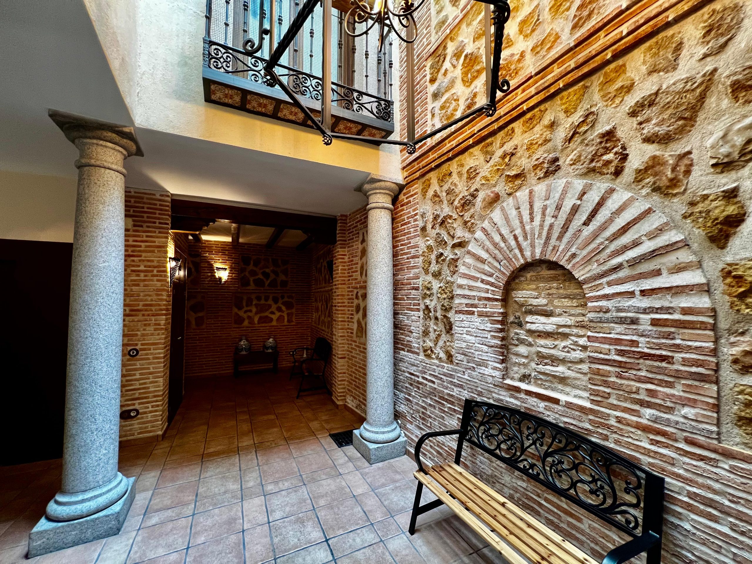 La vivienda, construida en estilo tradicional toledano, cuenta con tres plantas de altura, además de un sótano acondicionado tipo cueva, una azotea privada con vistas y un amplio garaje. Está distribuida en torno a un patio central cerrado y techado, que actúa como distribuidor de la planta baja. En él destacan sus columnas de granito y muros de ladrillo típico toledano, elementos que aportan carácter y autenticidad al conjunto.