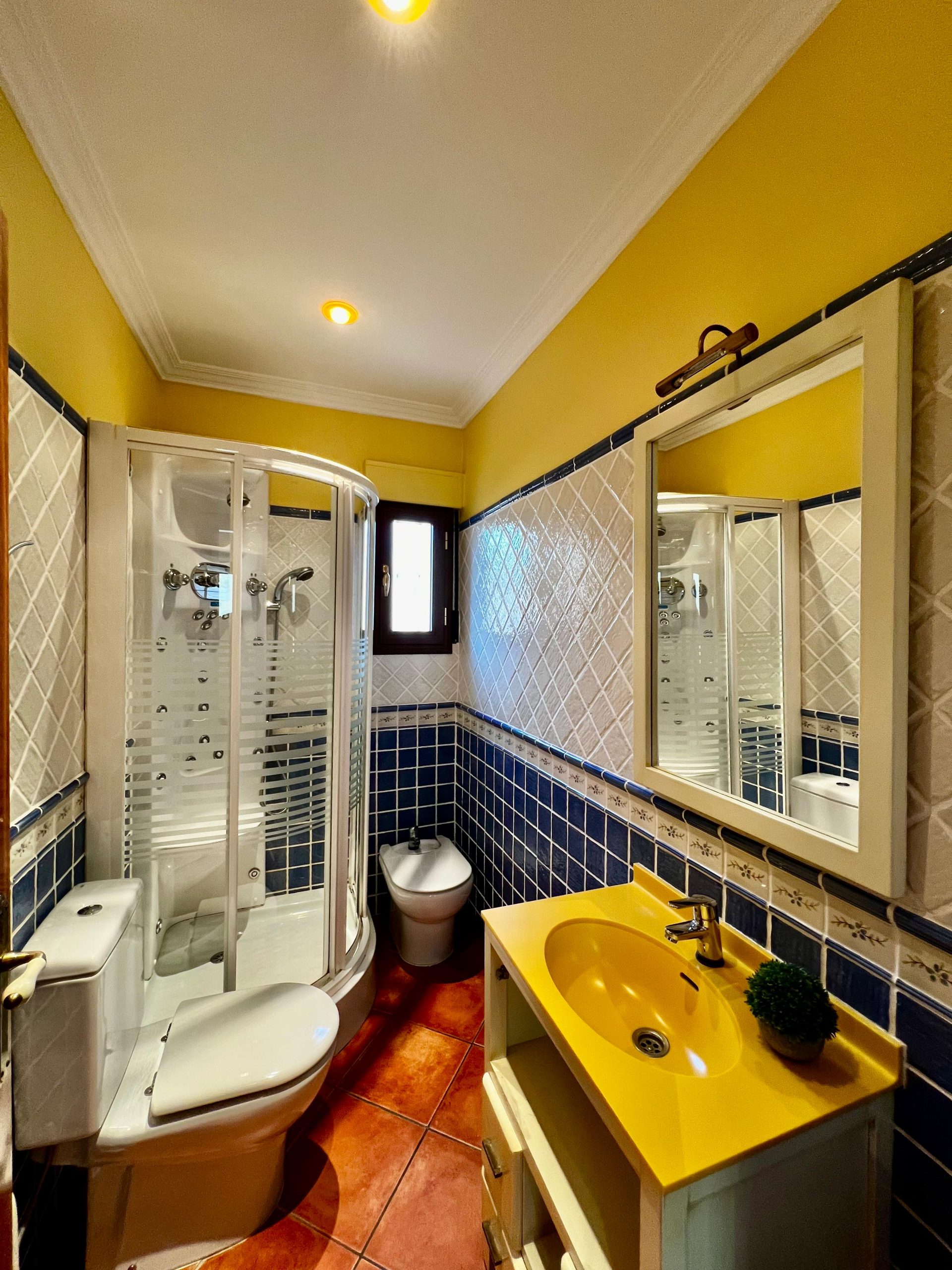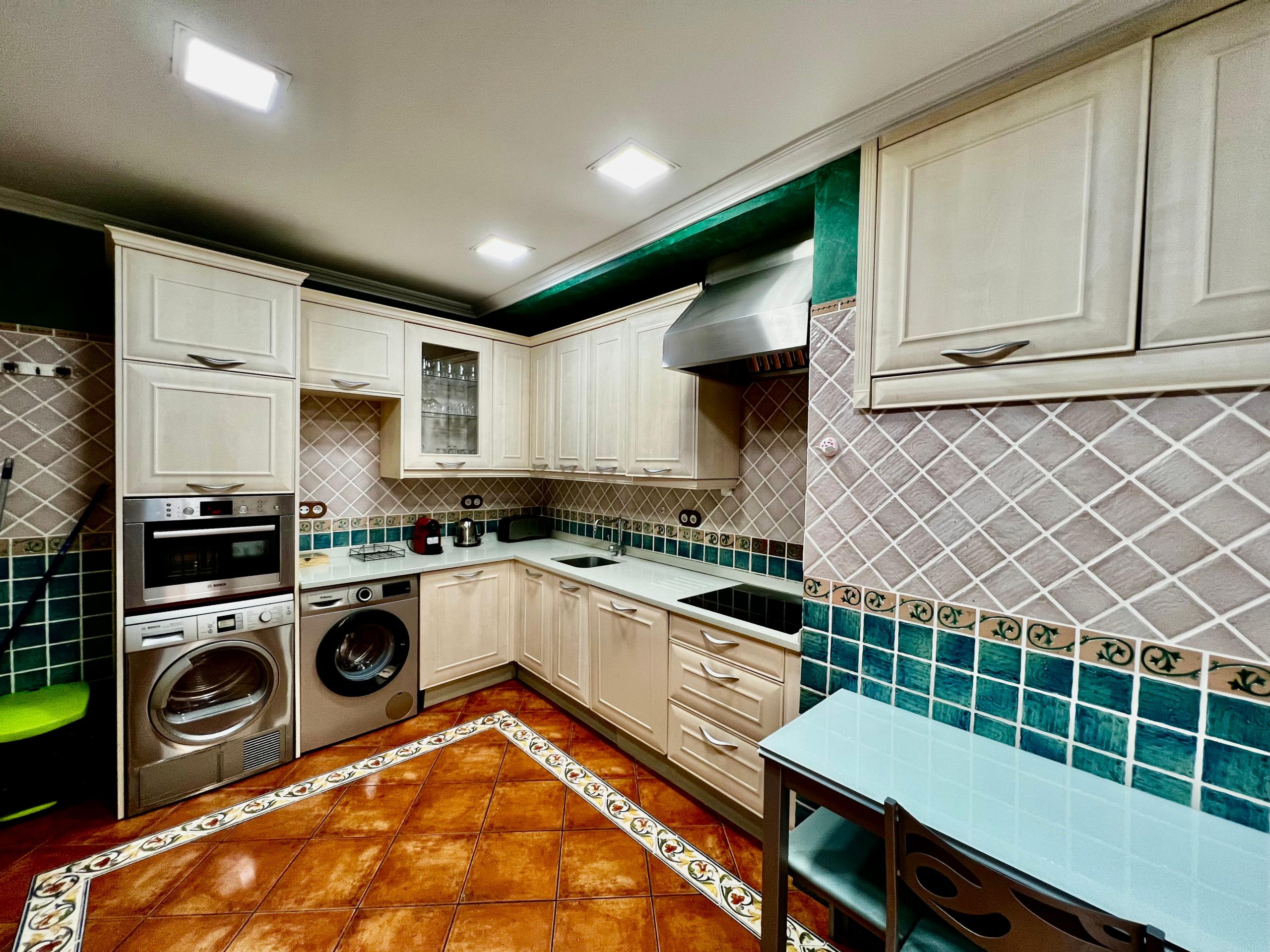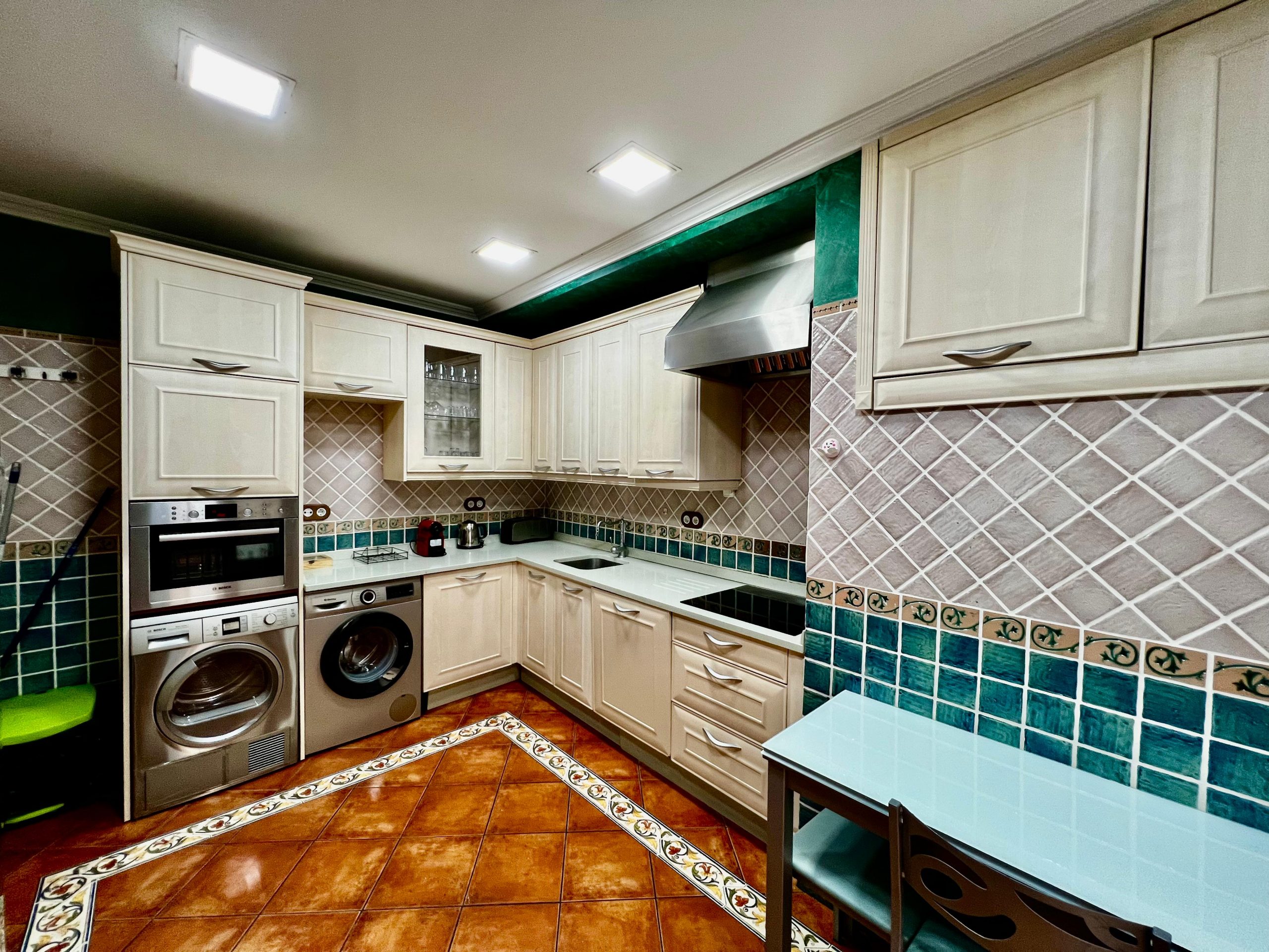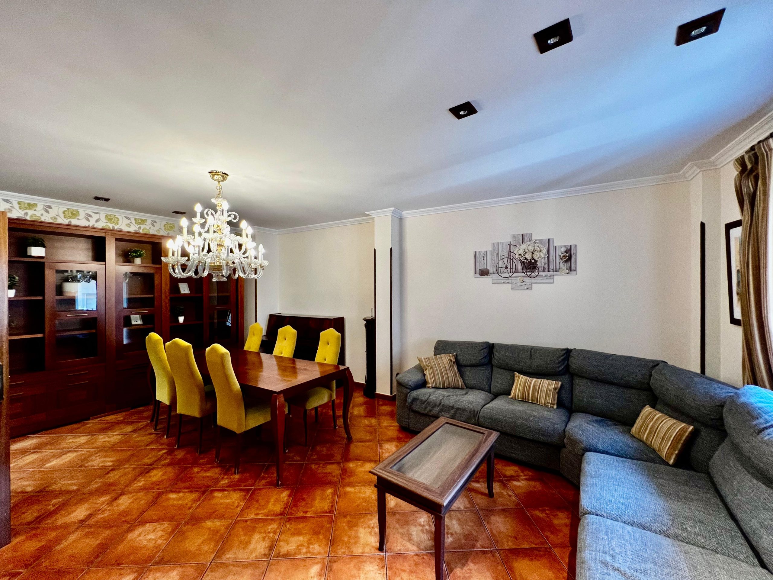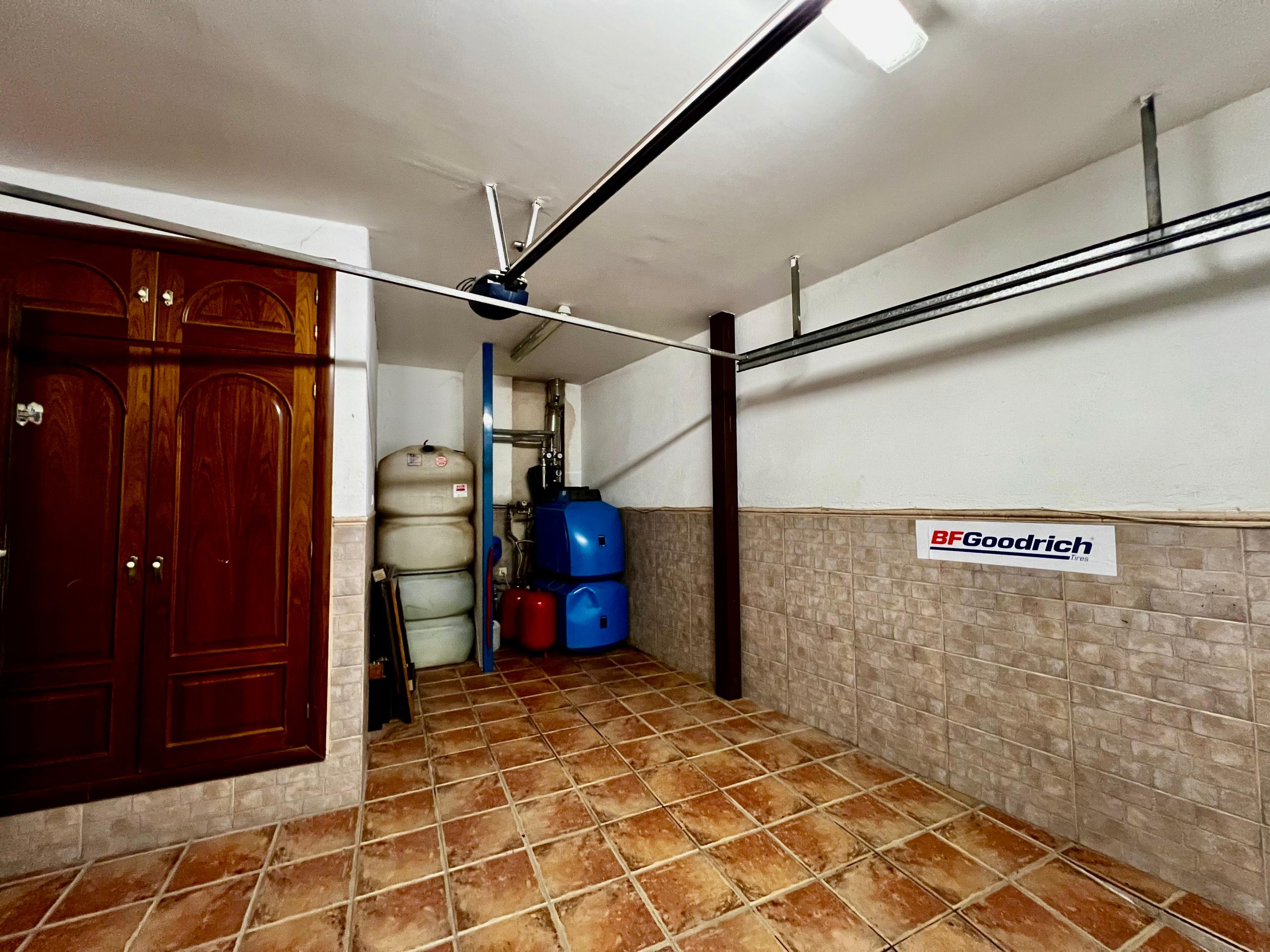 En la planta baja se ubican la cocina secundaria, un cuarto de baño completo, el acceso directo al garaje y la entrada al sótano, que ha sido acondicionado como espacio para reuniones o zona polivalente.
