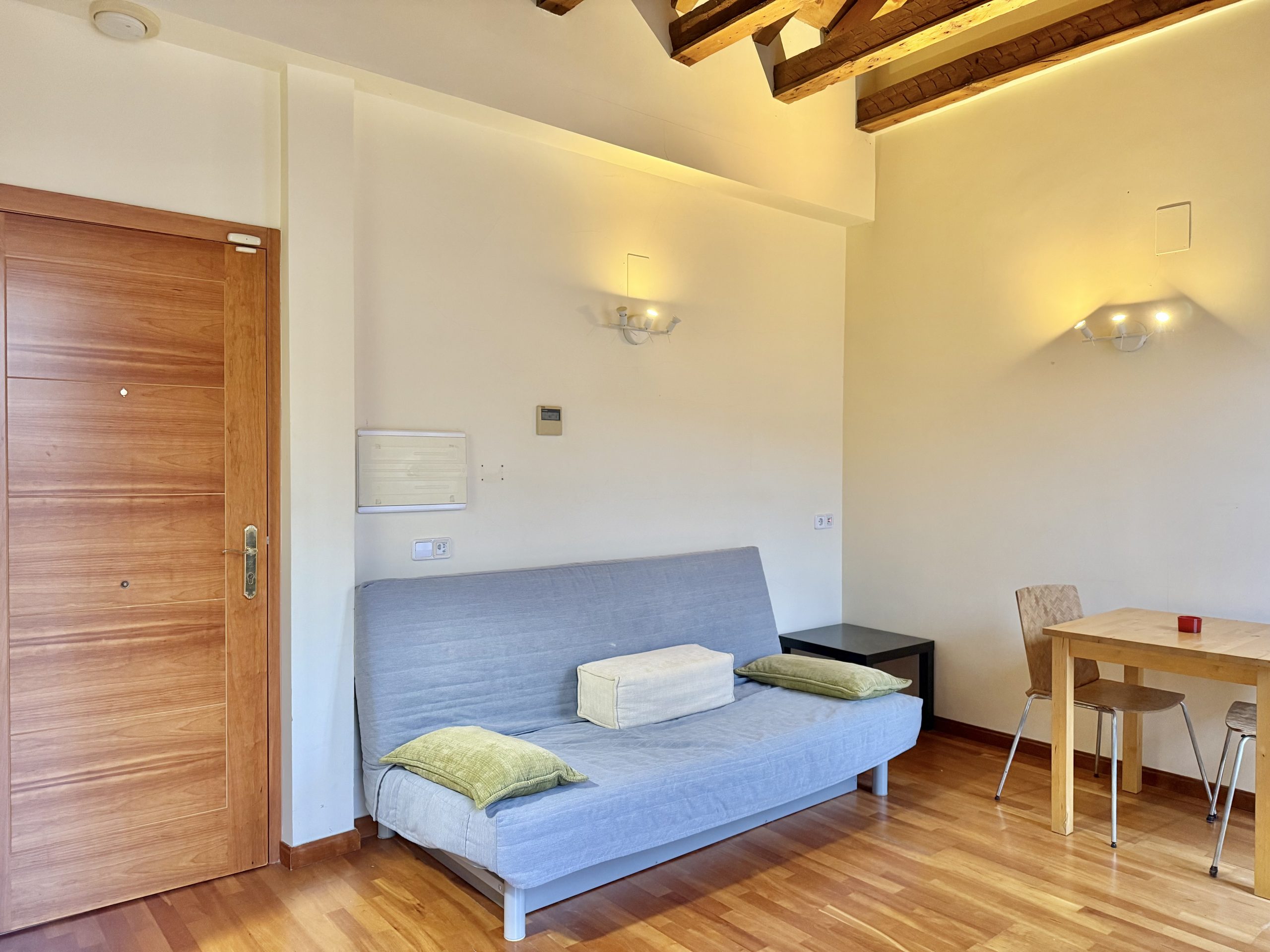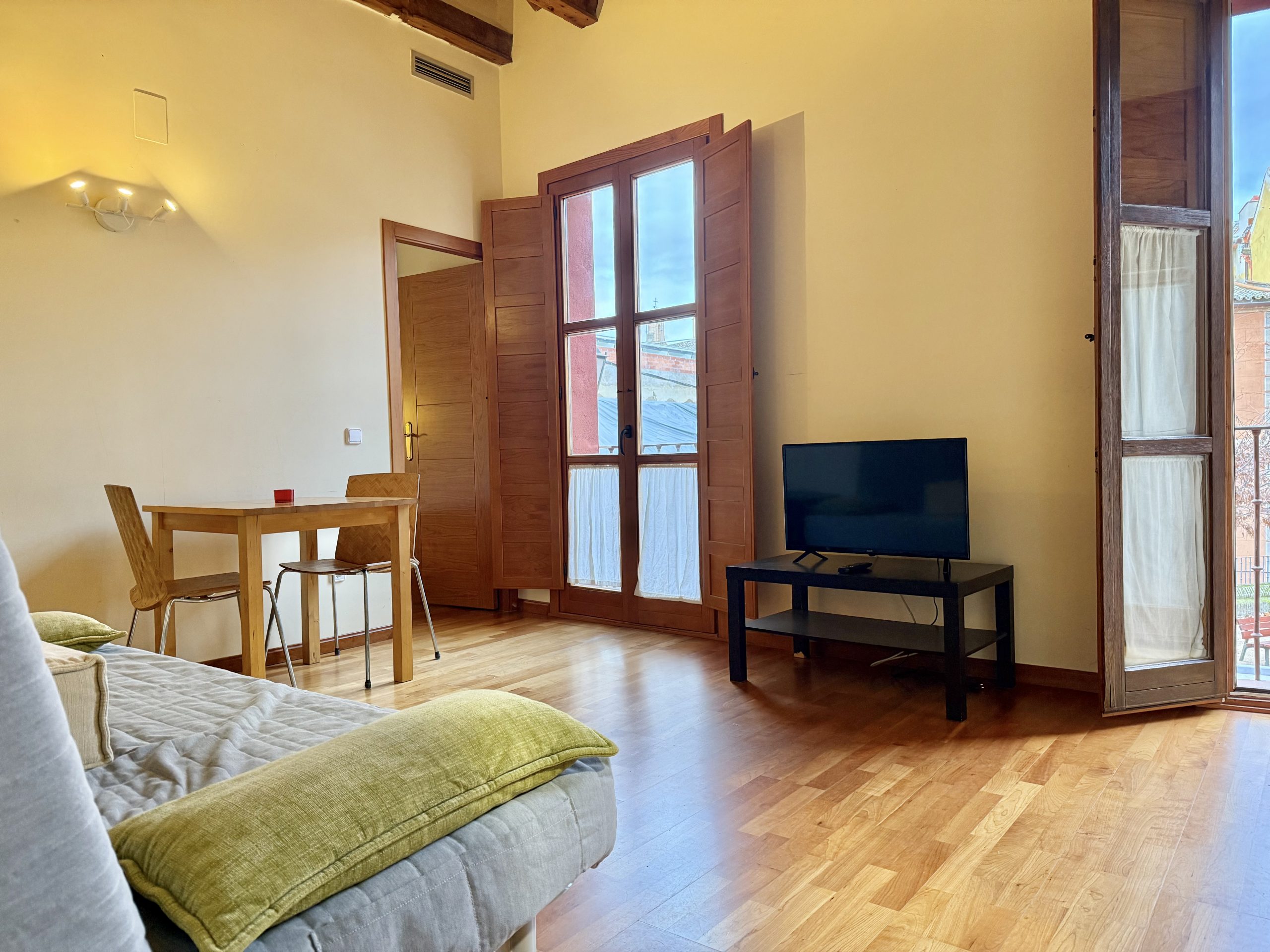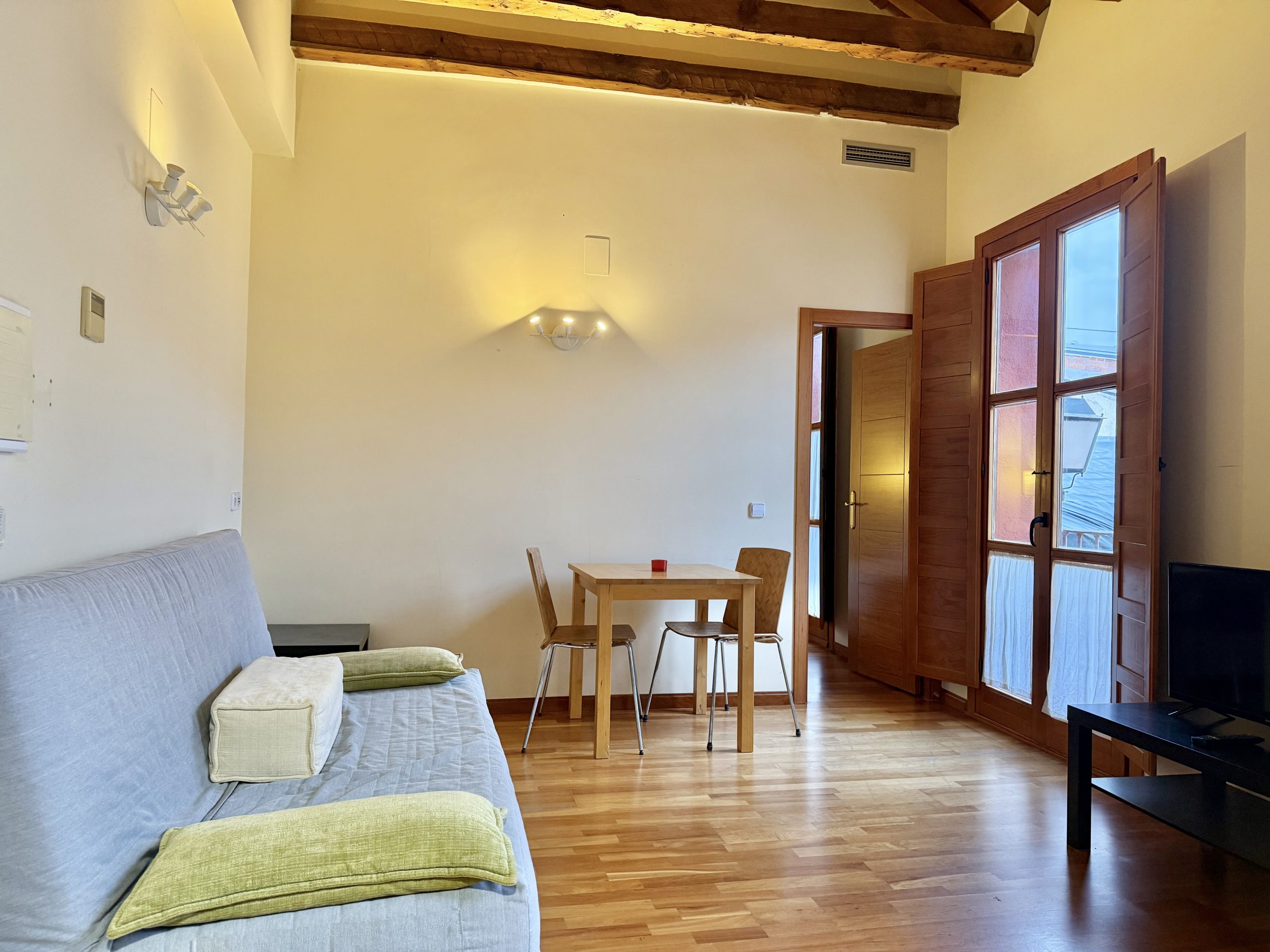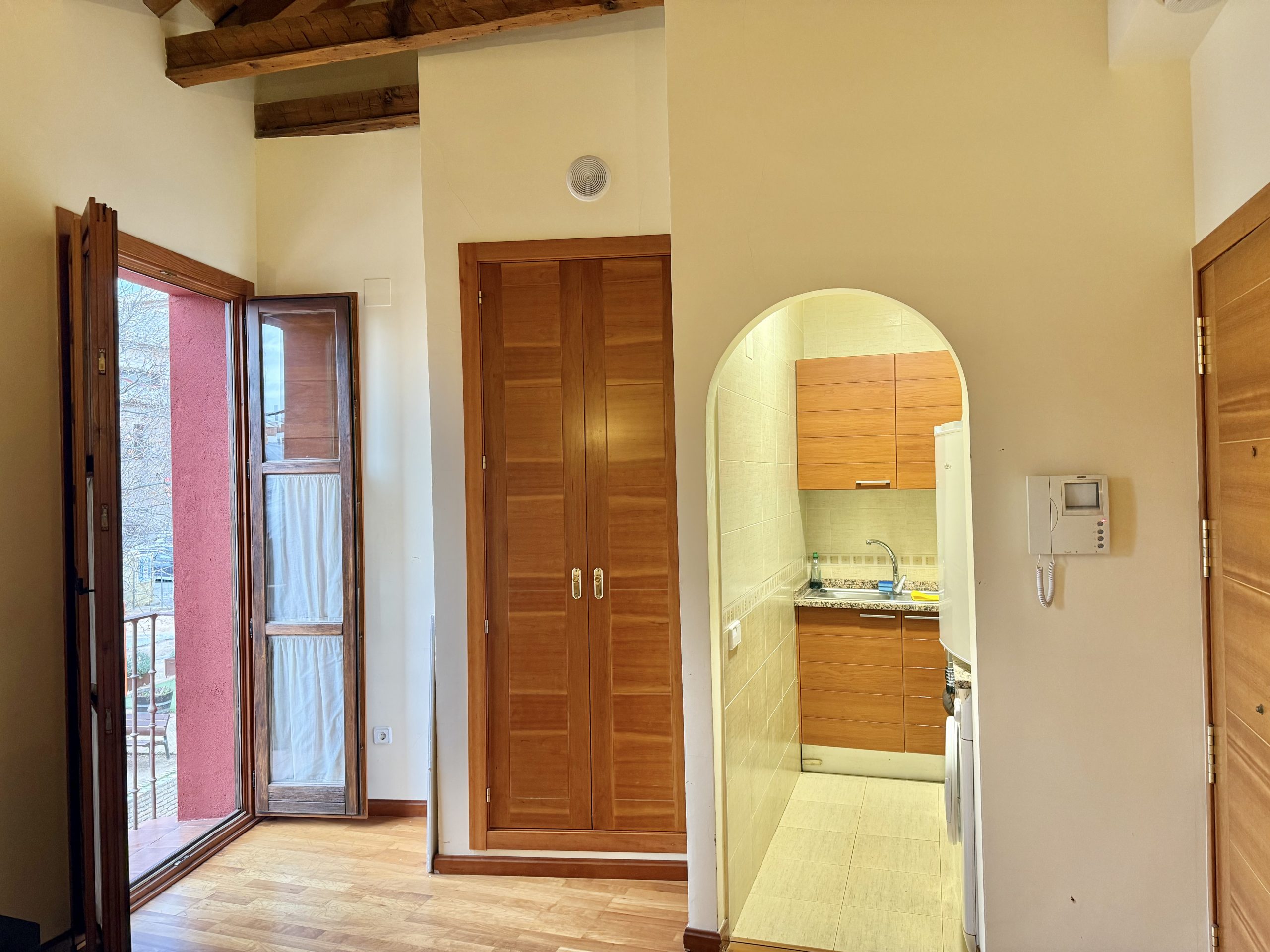 La vivienda cuenta con una superficie aproximada de 40 m², perfectamente distribuidos. Dispone de un salón amplio y muy luminoso, gracias a sus dos balcones con vistas directas a la plaza, que aportan una agradable entrada de luz natural durante todo el día. La cocina se encuentra integrada en el salón, creando un espacio funcional y moderno.