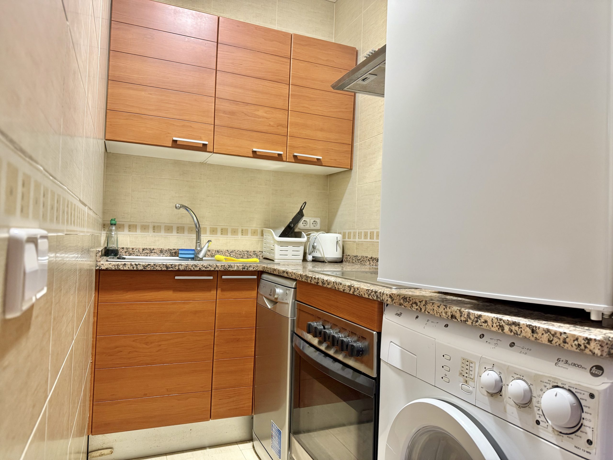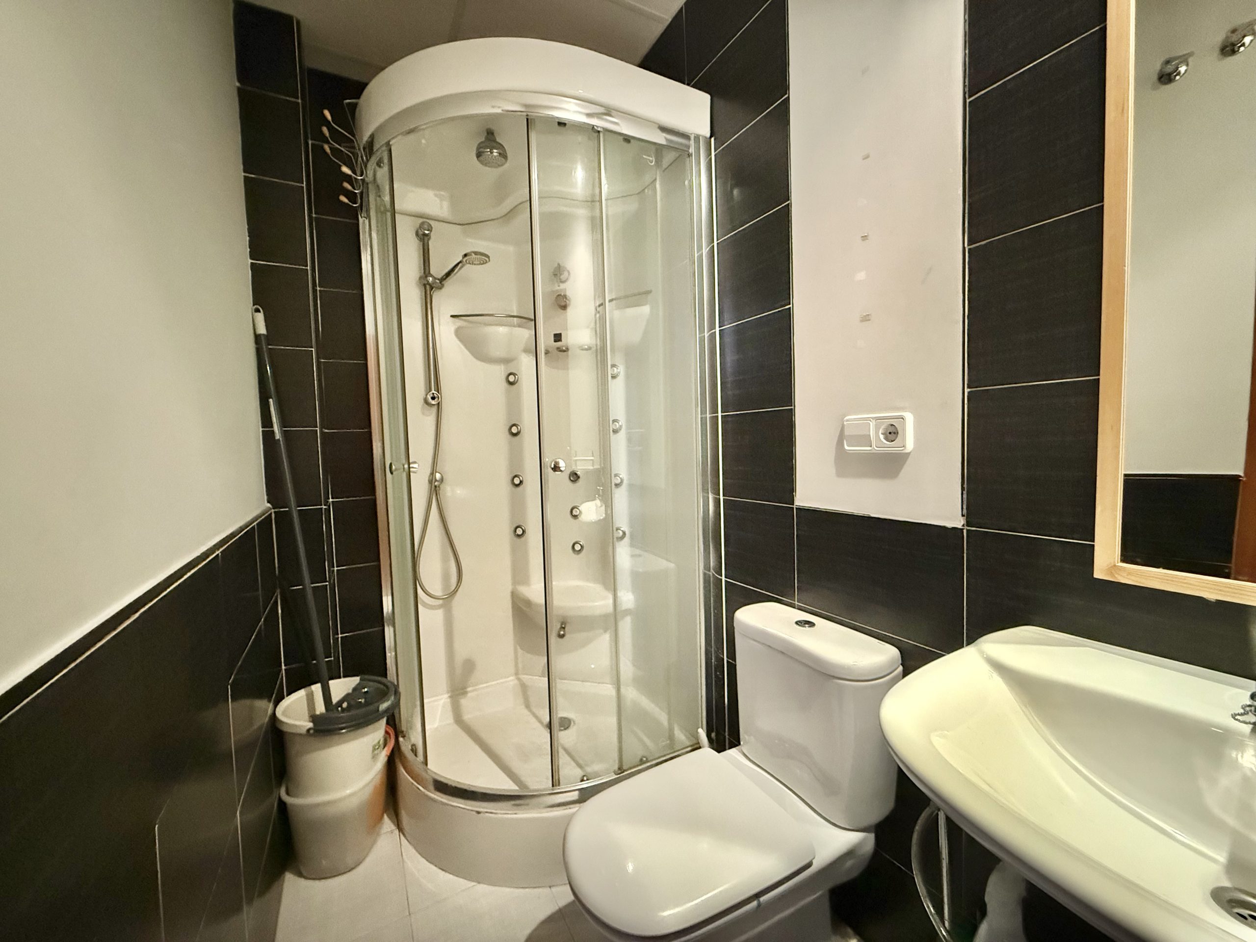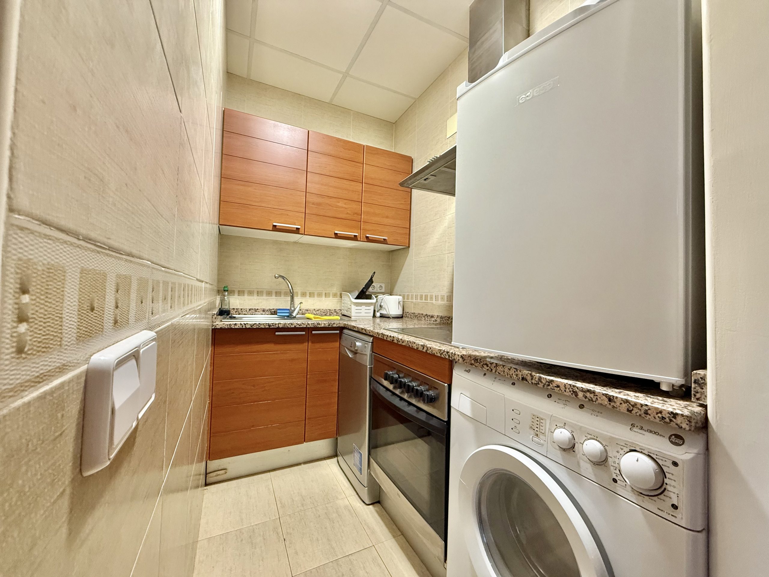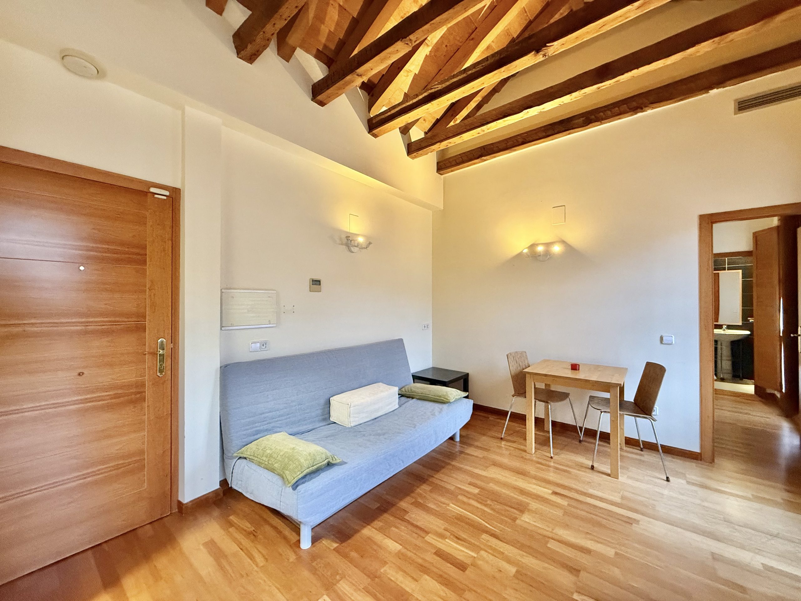 La vivienda cuenta con una superficie aproximada de 40 m², perfectamente distribuidos. Dispone de un salón amplio y muy luminoso, gracias a sus dos balcones con vistas directas a la plaza, que aportan una agradable entrada de luz natural durante todo el día. La cocina se encuentra integrada en el salón, creando un espacio funcional y moderno.