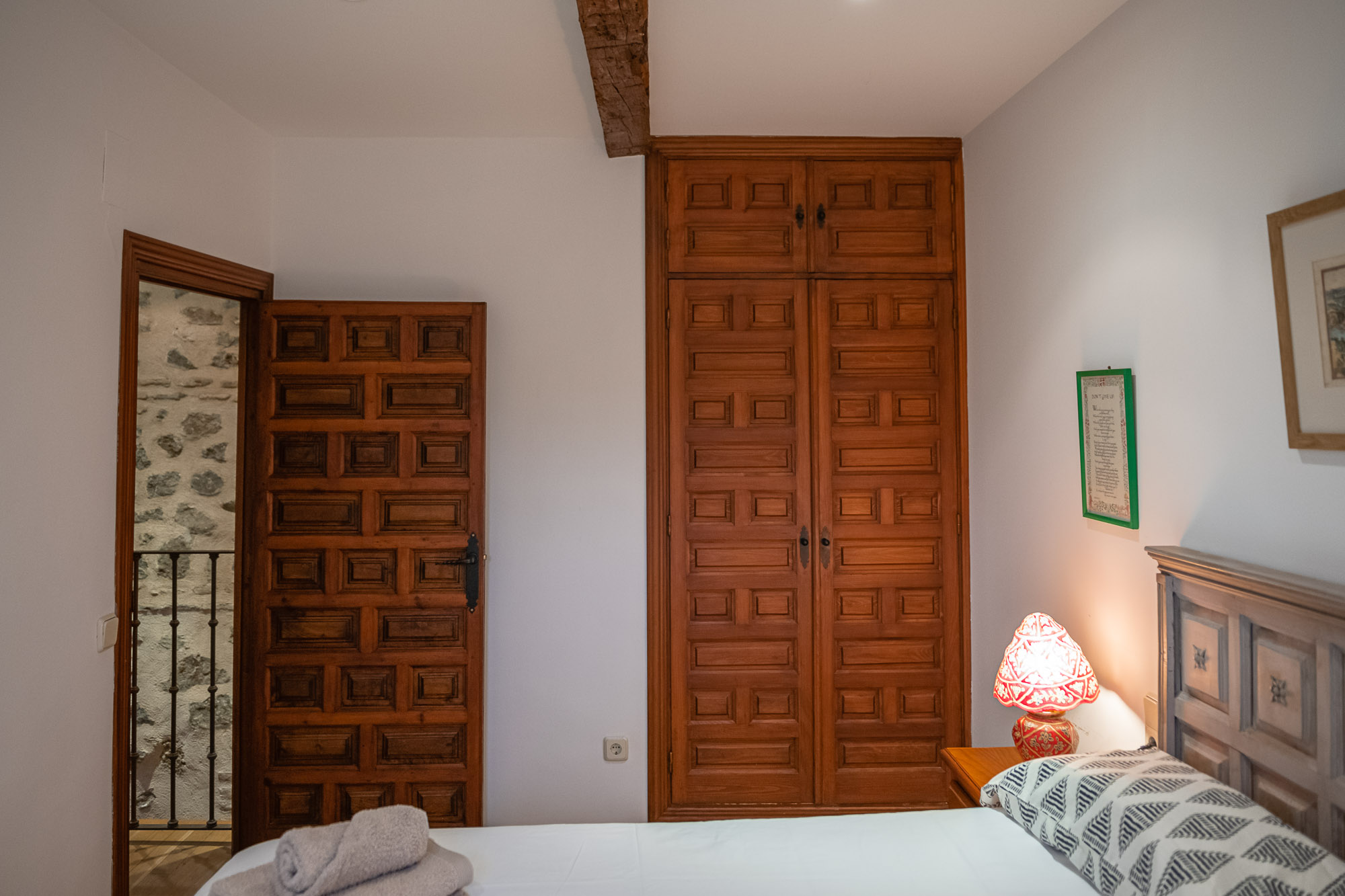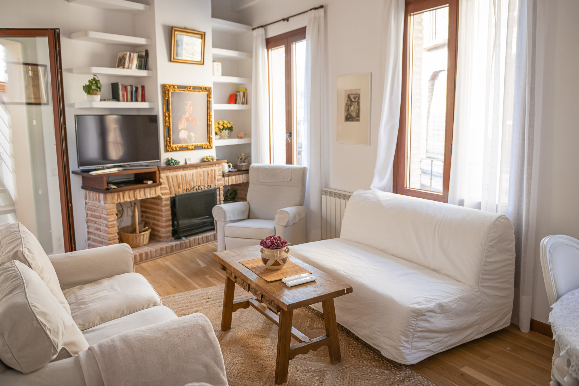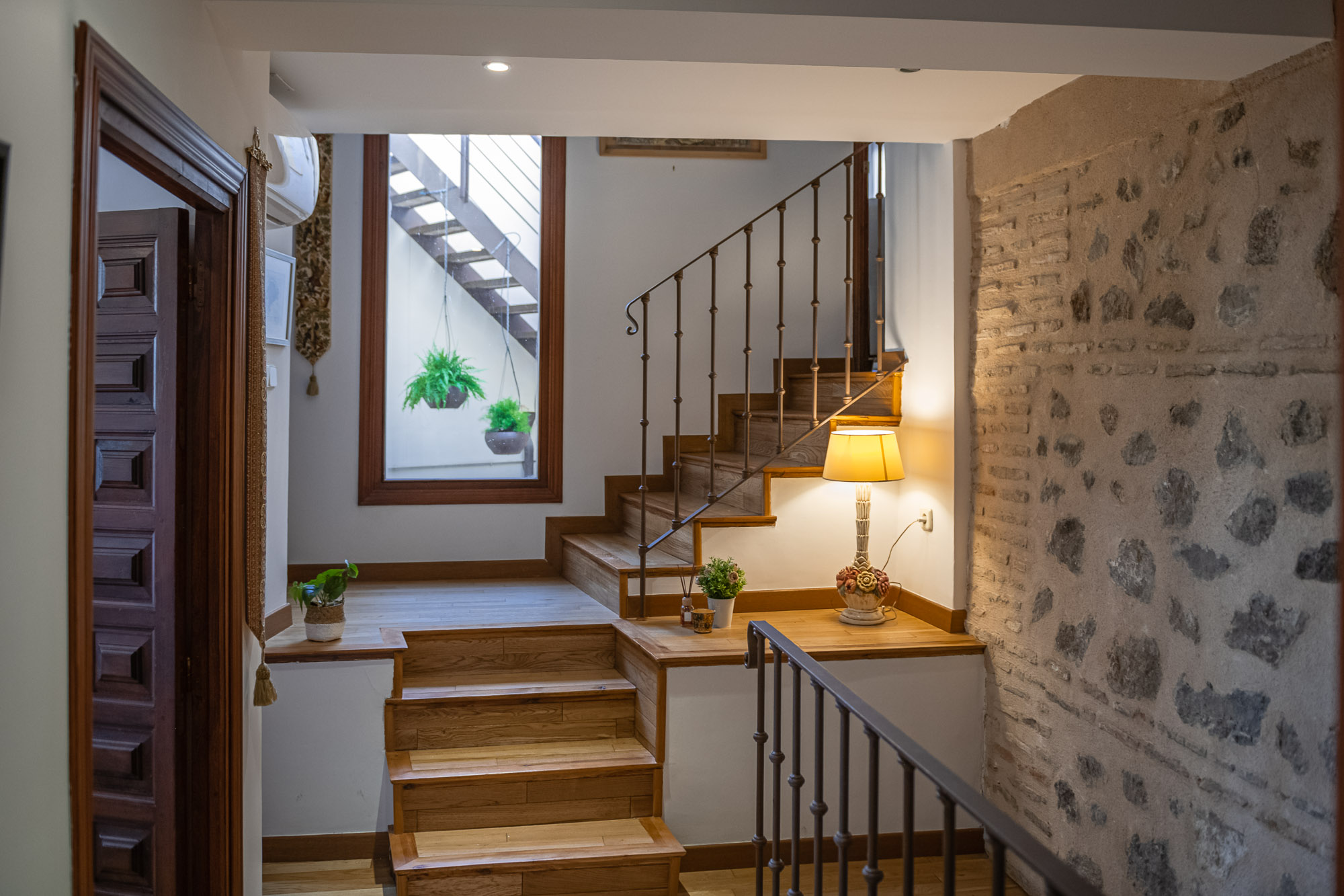 En la primera planta, encontrarás dos dormitorios, un baño, una cocina totalmente equipada y un salón luminoso con chimenea y balcones que ofrecen vistas al exterior. La joya de la casa es su azotea privada, desde donde podrás disfrutar de vistas impresionantes a las sinagogas, San Juan de los Reyes y el valle. El pequeño patio con zona techada es perfecto para relajarte al aire libre, rodeado de plantas con el sonido del agua de su fuente.