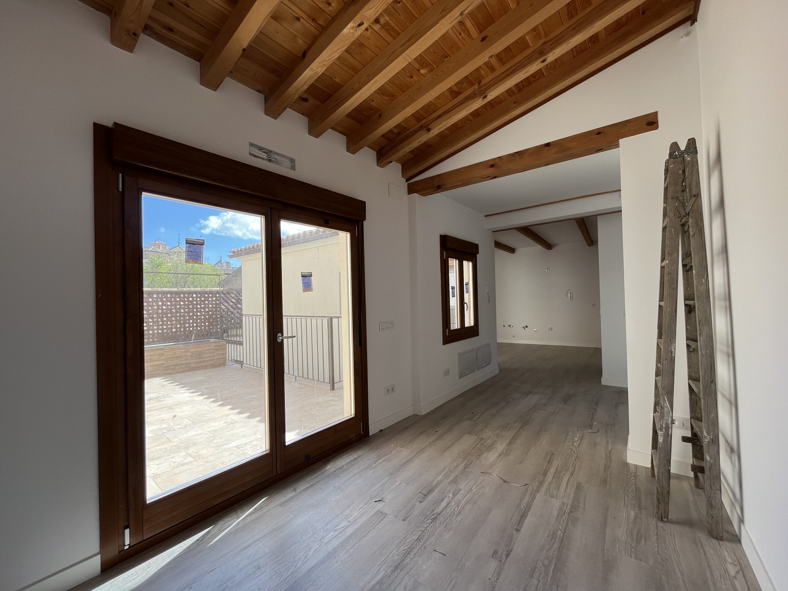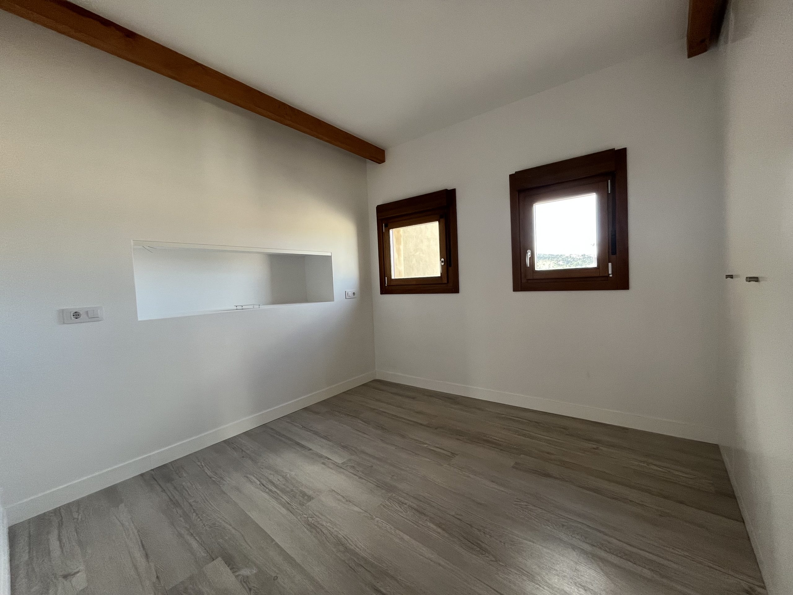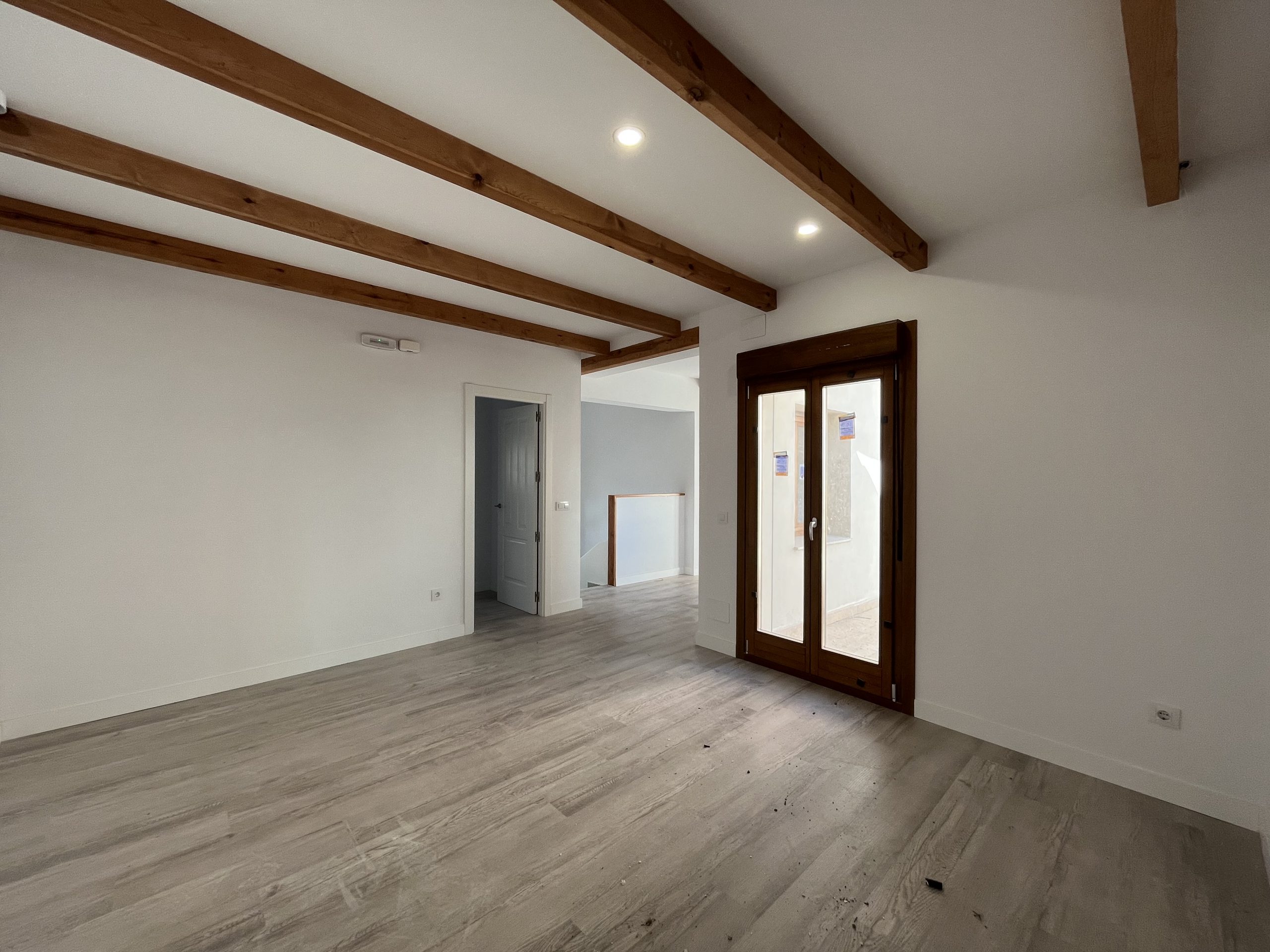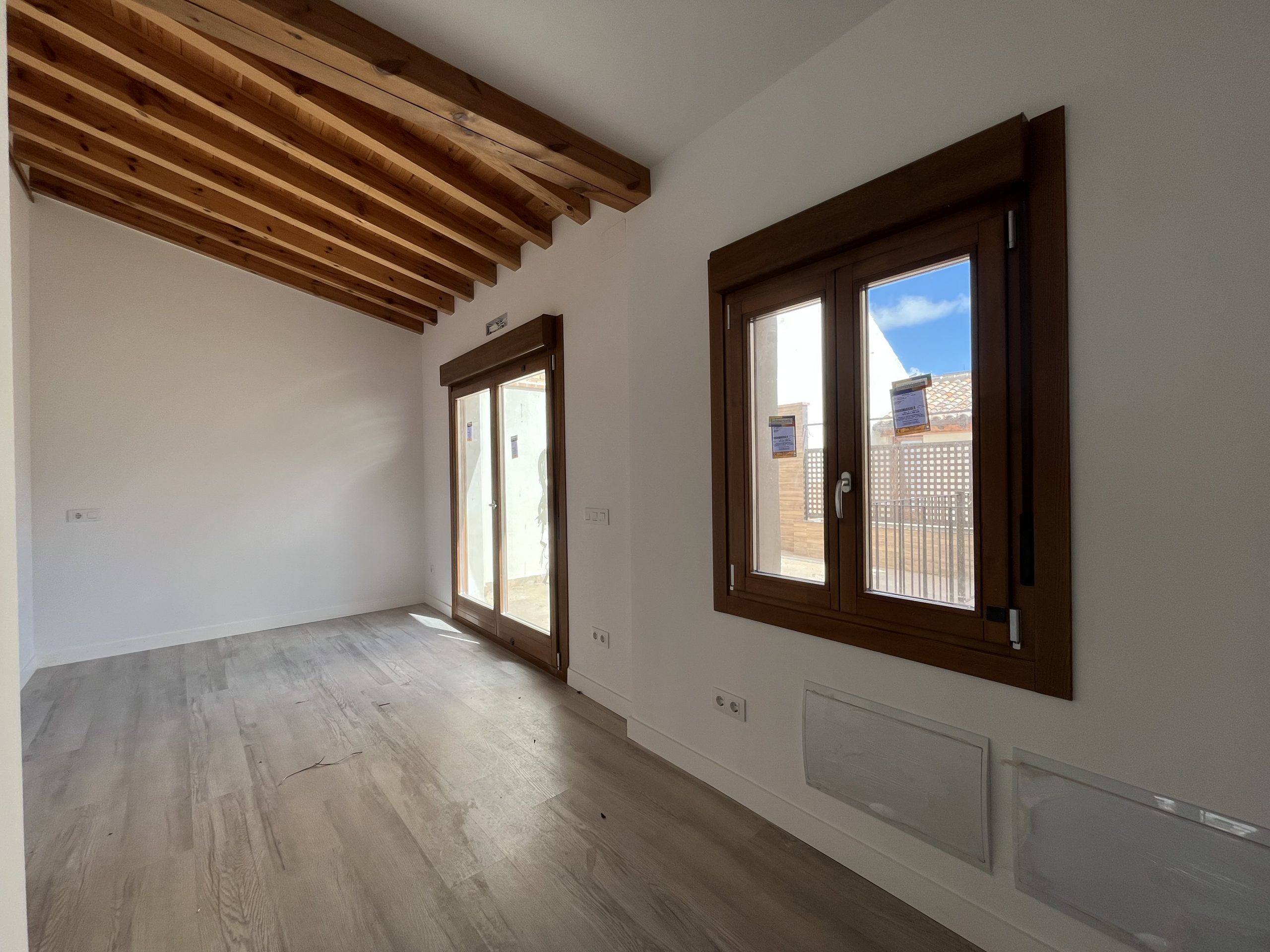Materiales y acabados de primera calidad, con suelos de tarima, vigas de madera vista en techos, iluminación led, ventanas Shitecma con carpinterías de madera y doble acristalamiento, bombas frio/calor de primeras marcas, baños con baldosa hidráulica.