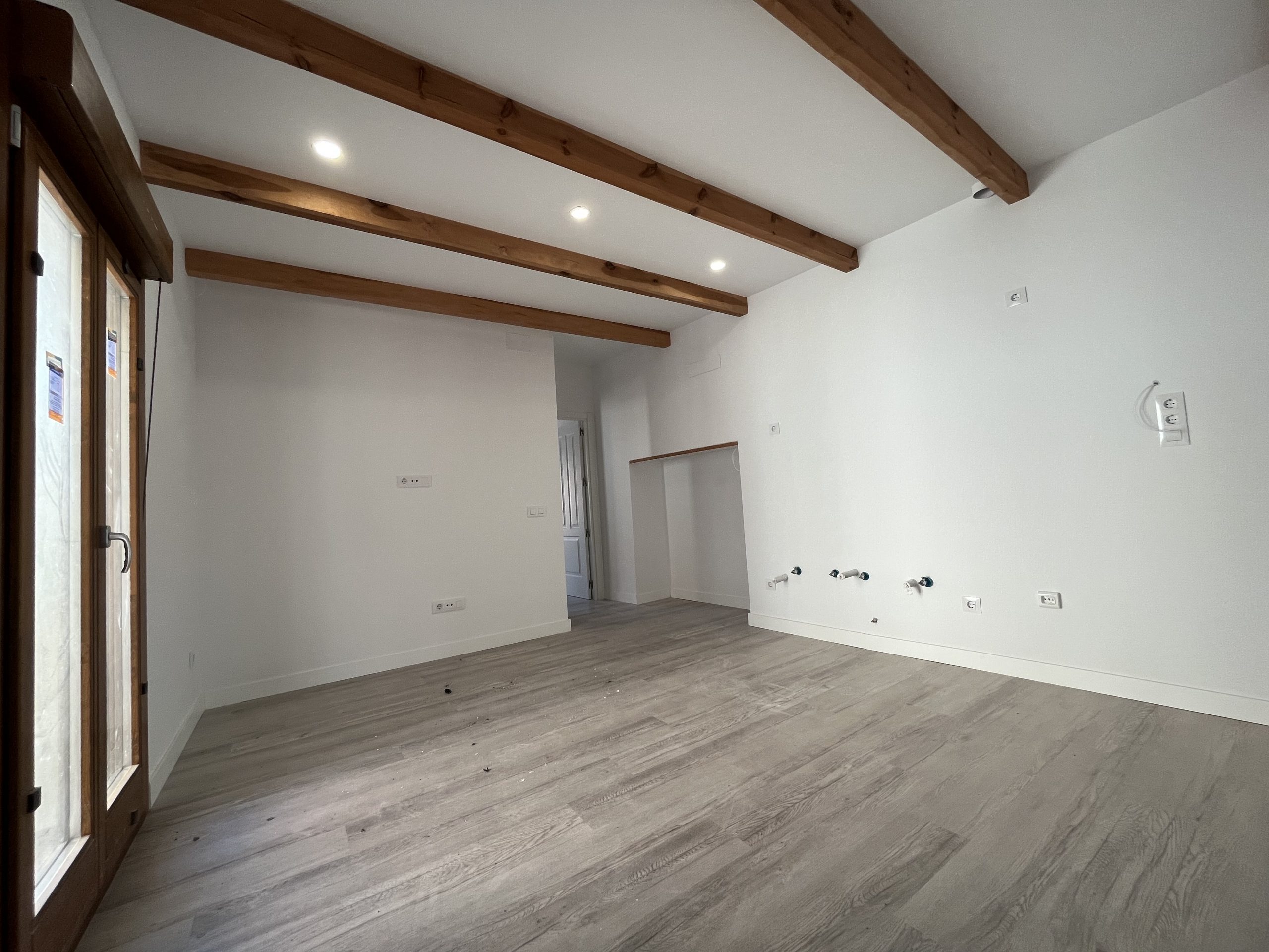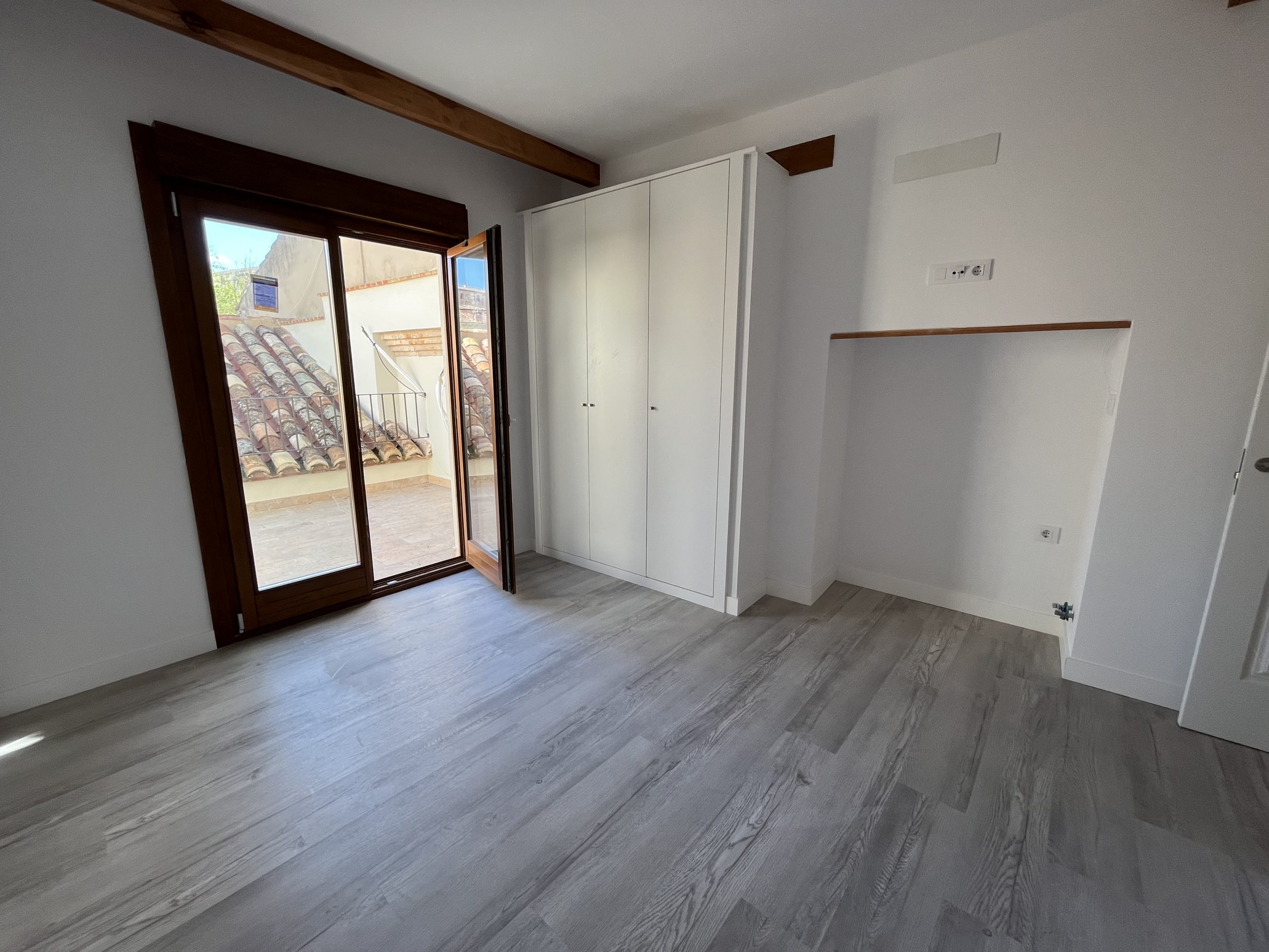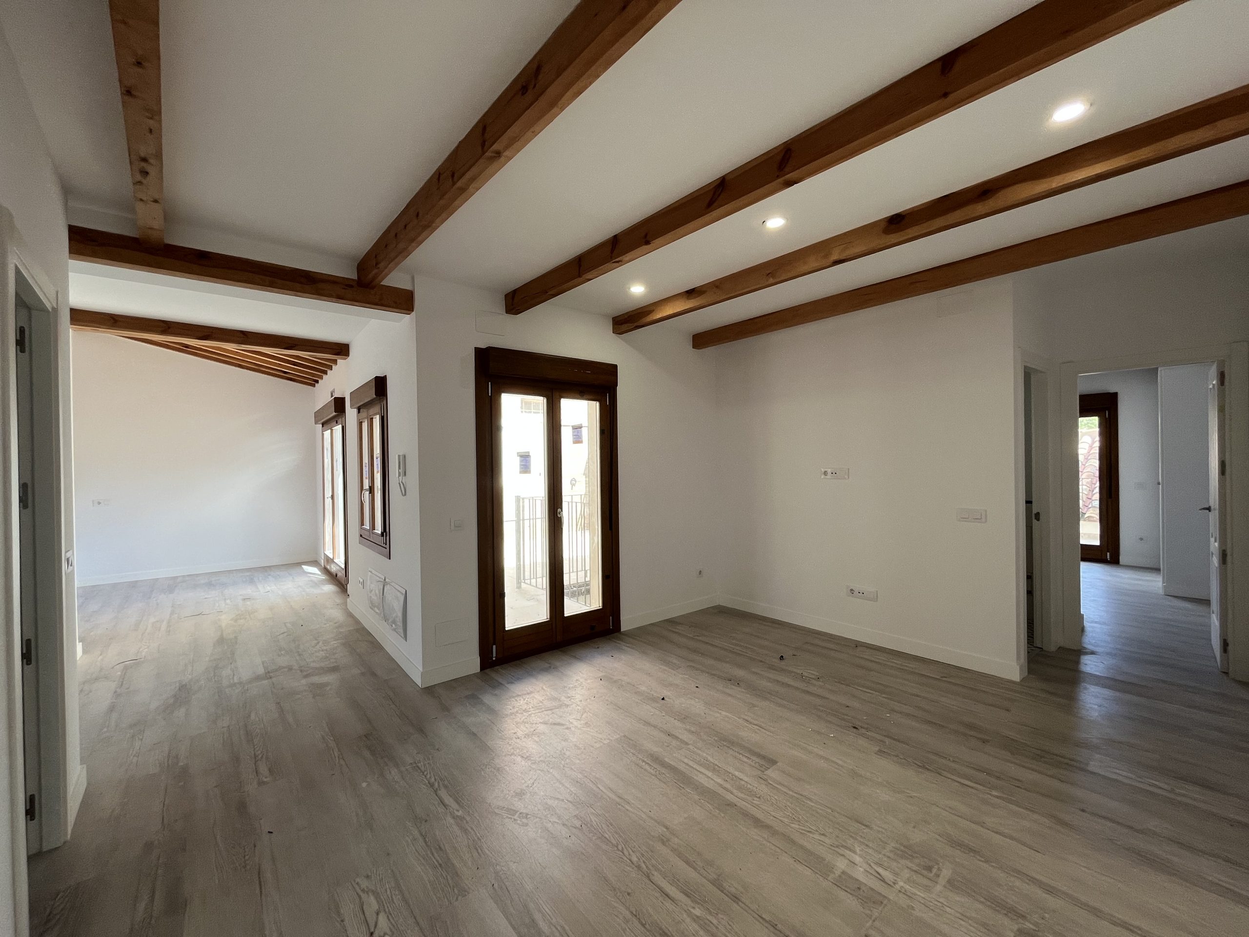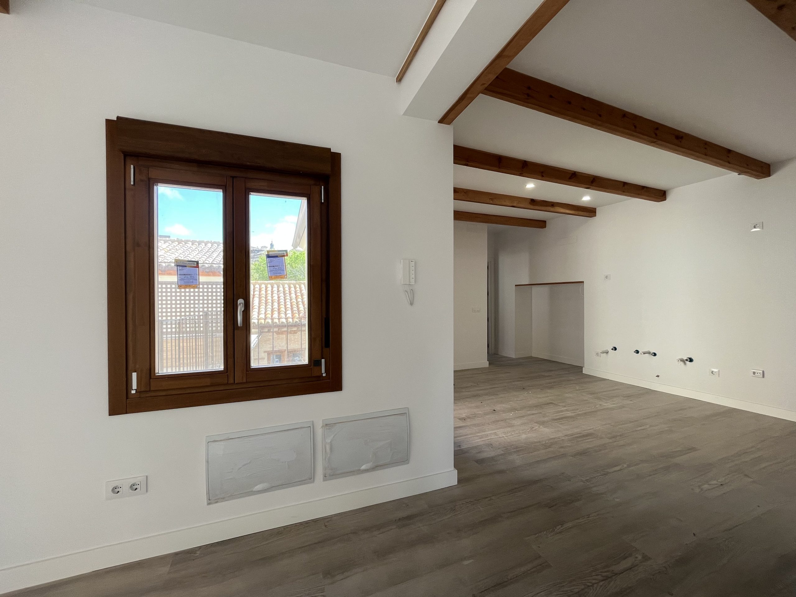 Materiales y acabados de primera calidad, con suelos de tarima, vigas de madera vista en techos, iluminación led, ventanas Shitecma con carpinterías de madera y doble acristalamiento, bombas frio/calor de primeras marcas, baños con baldosa hidráulica.